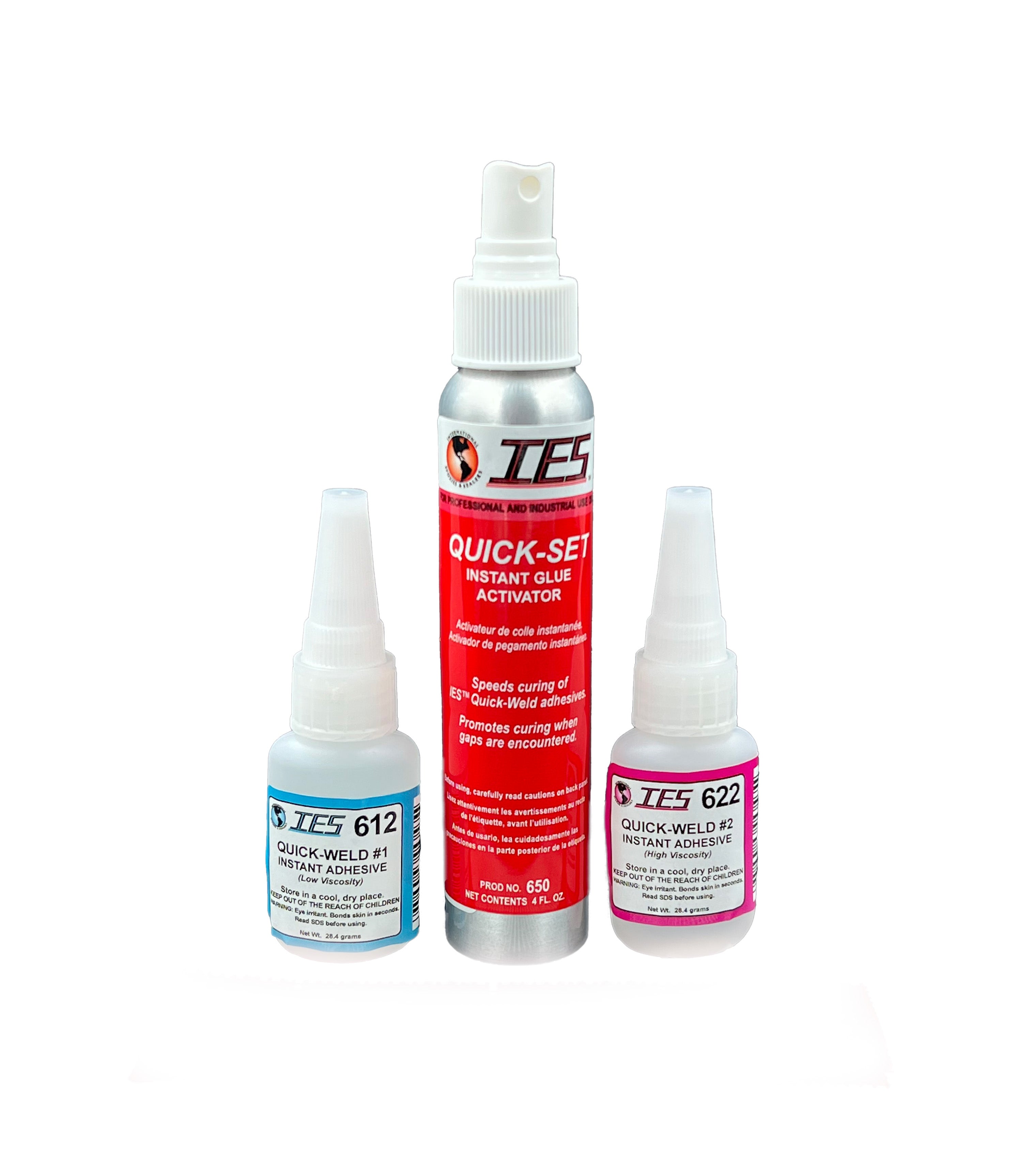 Quick-Weld adhesive kit used for applications requiring both a high and low viscosity adhesive and activator spray. |